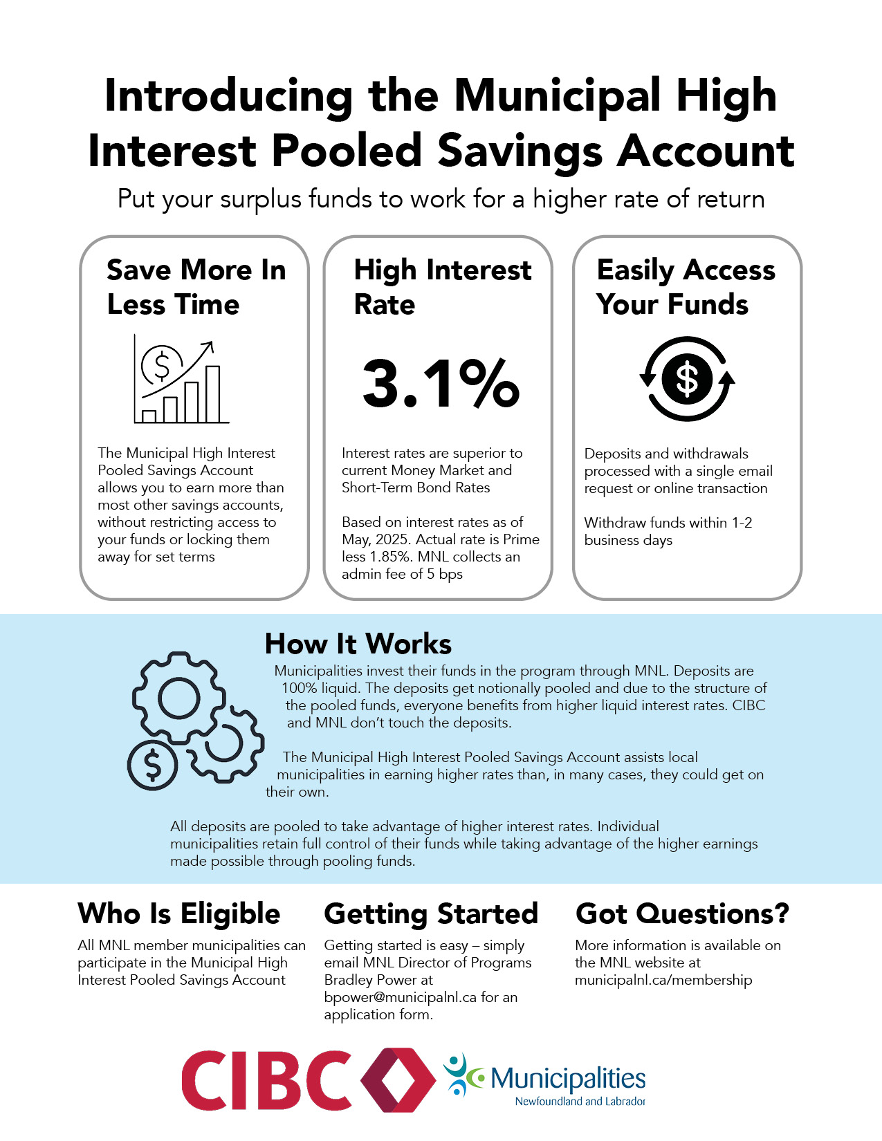 MNL has partnered with CIBC to offer members a new Municipal High Interest Pooled Savings Account that has no minimum deposit and allows you to withdraw funds at any time.